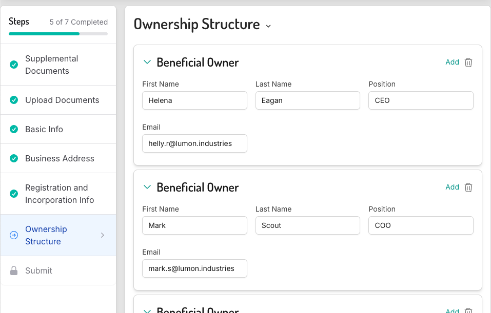 Invite UBOs via email to complete KYC using our self-service onboarding process.